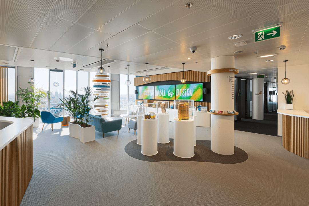 Raumgewordene Markenbotschaften säumen den Weg von Besuchern sowie Mitarbeitern sobald sie das Foyer betreten. Herzstück des neuen Raumkonzepts ist eine multifunktionale, digitale Lösung die sich harmonisch ins Interior Design einfügt. Das digitale Sonderformat präsentiert sich als flexibel bespielbare Leinwand für Marken- und Produktbotschaft des neuen Mondi-Zeitalters.